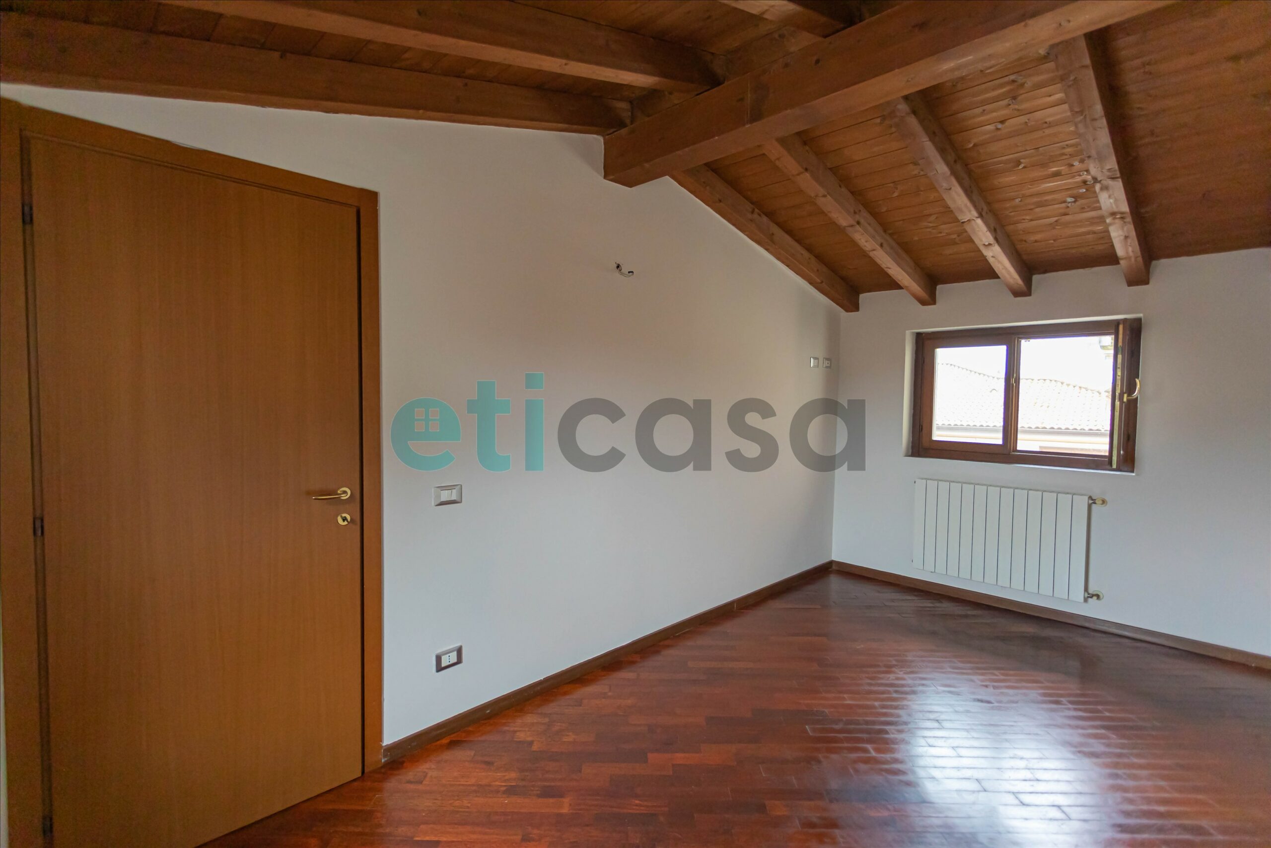 L’ingresso conduce a una cucina abitabile di generose dimensioni, con accesso al balcone, separata dal soggiorno, luminoso e ben proporzionato. Il bagno è finestrato, con vasca da bagno. La camera da letto matrimoniale, ampia e confortevole, è impreziosita da pavimento in parquet e soffitto con travi a vista, che donano calore e carattere all’ambiente.