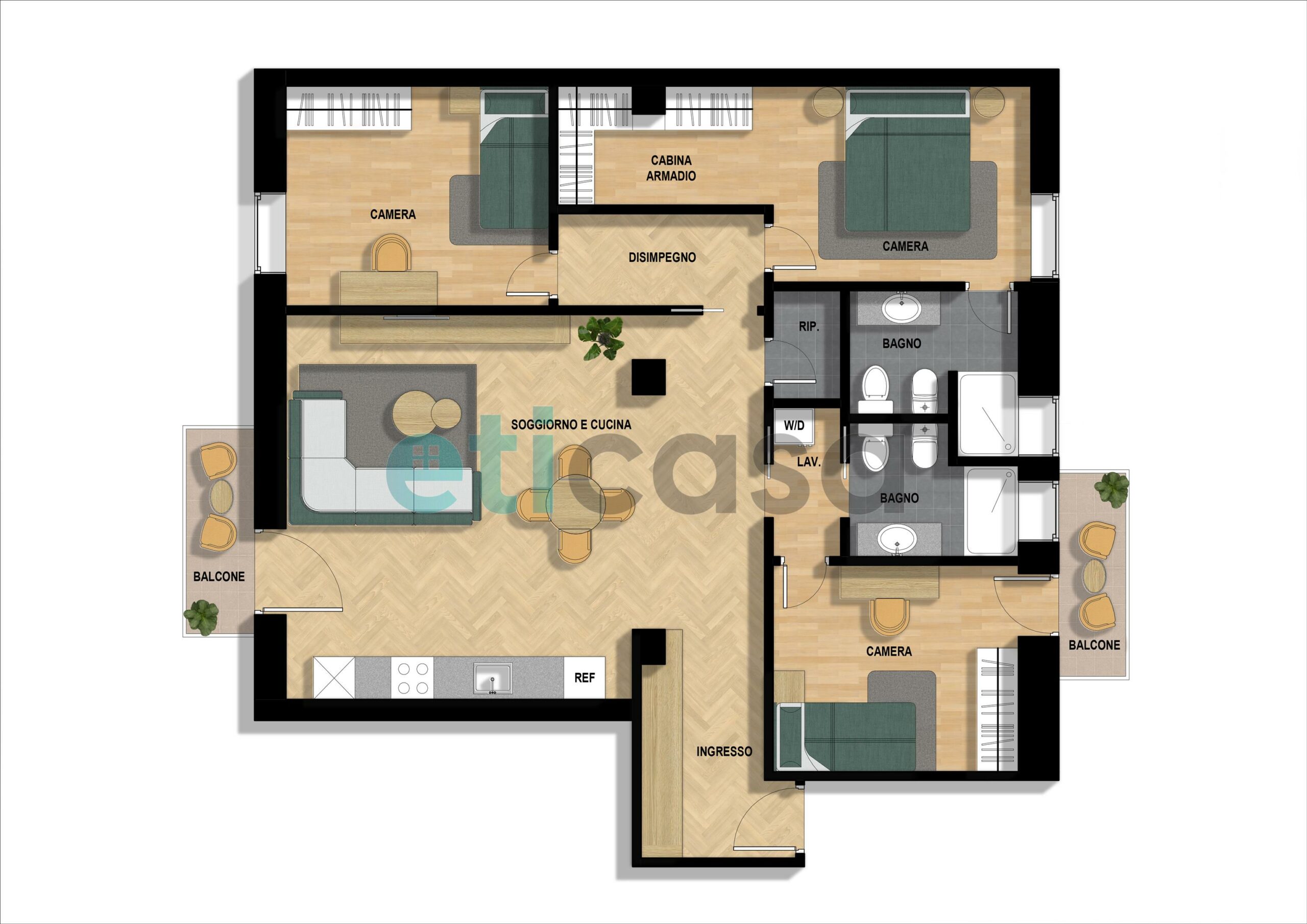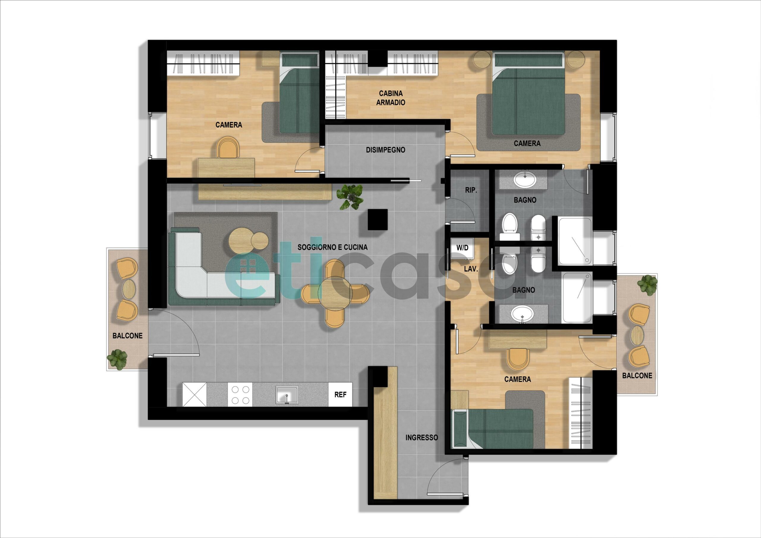 - tre camere, due singole (di cui una con balcone) ed una matrimoniale con bagno privato con doccia finestrato e cabina armadio