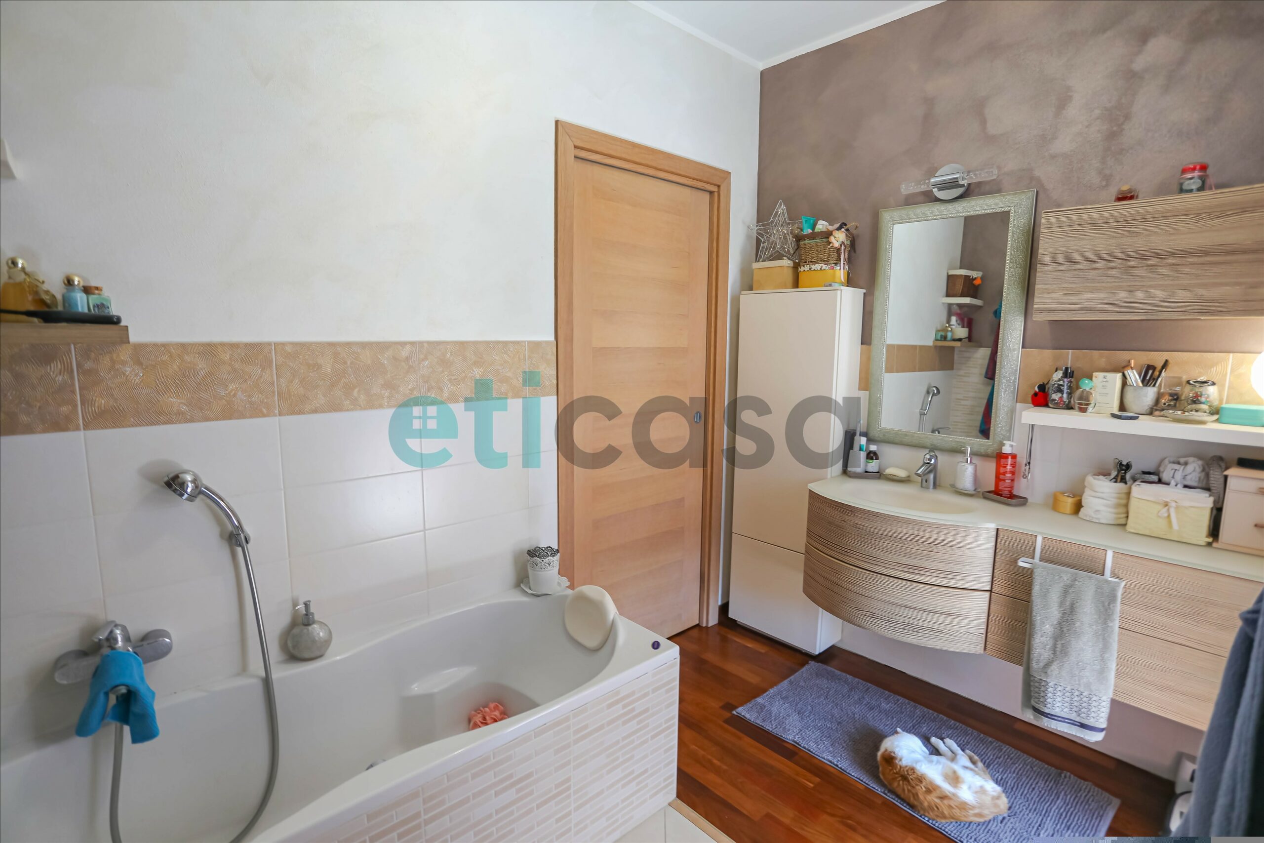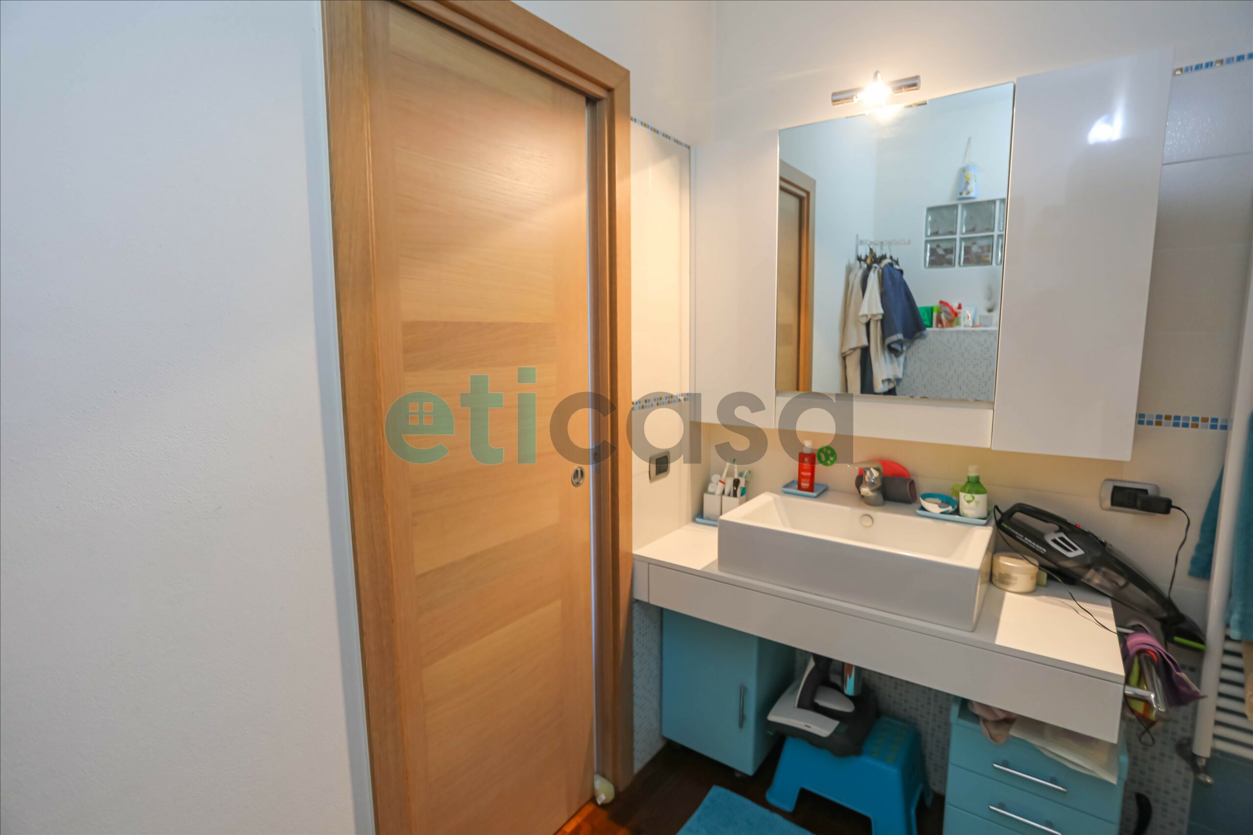 Porte interne tutte scorrevoli in rovere, pavimenti in parquet, bagni e zona cucina con inserti in gres porcellanato.