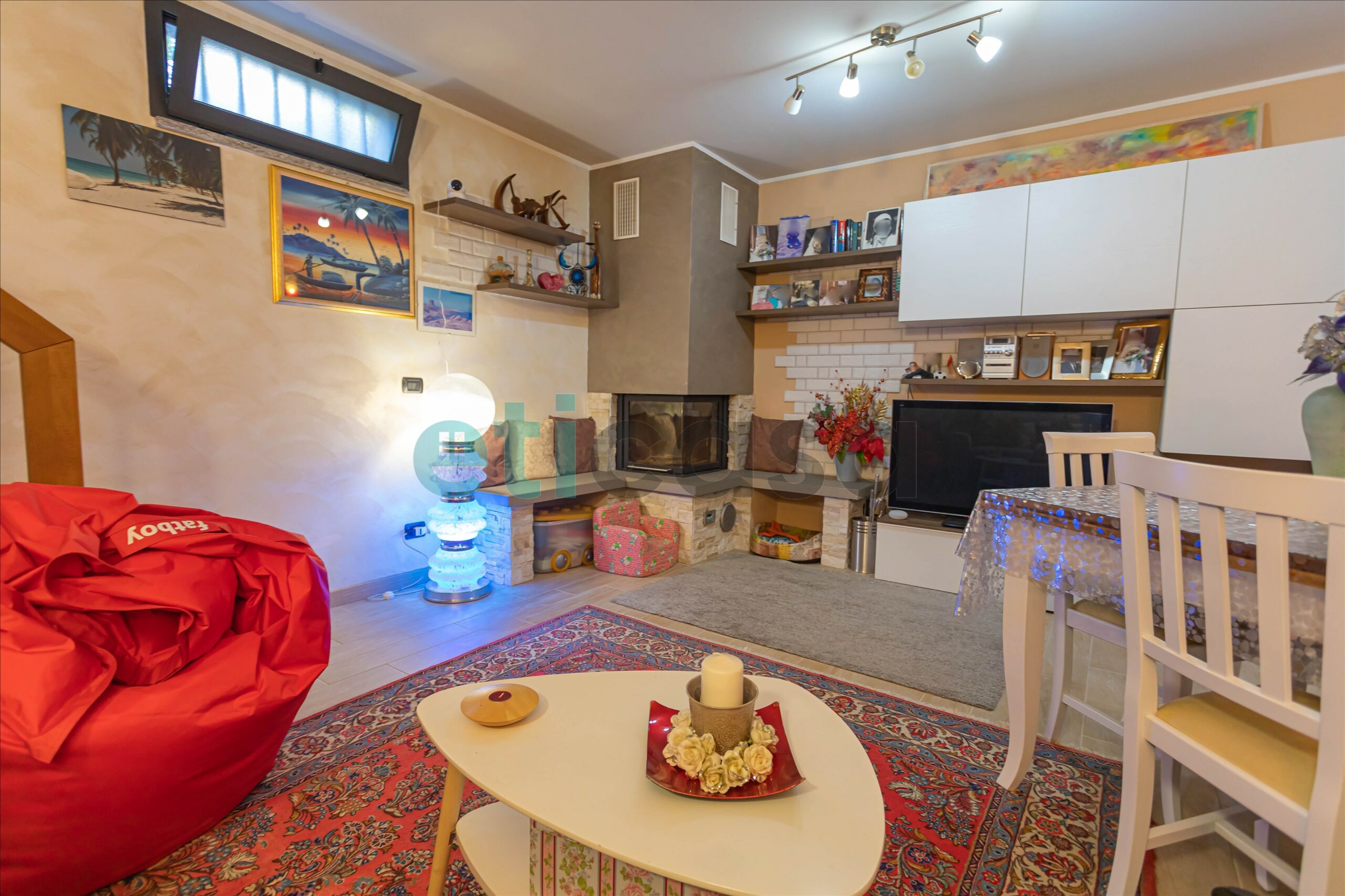Dal soggiorno si accede tramite scala interna alla tavernetta con camino, perfetta come zona relax, studio o spazio per le passioni. Qui è presente una predisposizione per un ulteriore bagno. Collegato internamente troviamo anche il garage doppio di circa 31 mq, con basculante elettrico, lavatoio e illuminazione.
