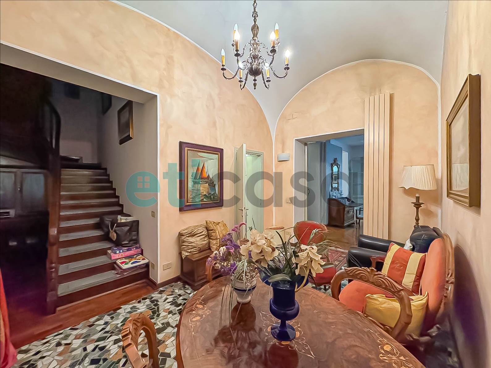 L’appartamento si sviluppa principalmente al primo piano ed è caratterizzato da ambienti ampi, eleganti e ricchi di potenziale. L’ingresso si apre su una anticamera che conduce a un comodo disimpegno con lavanderia e bagno di servizio.