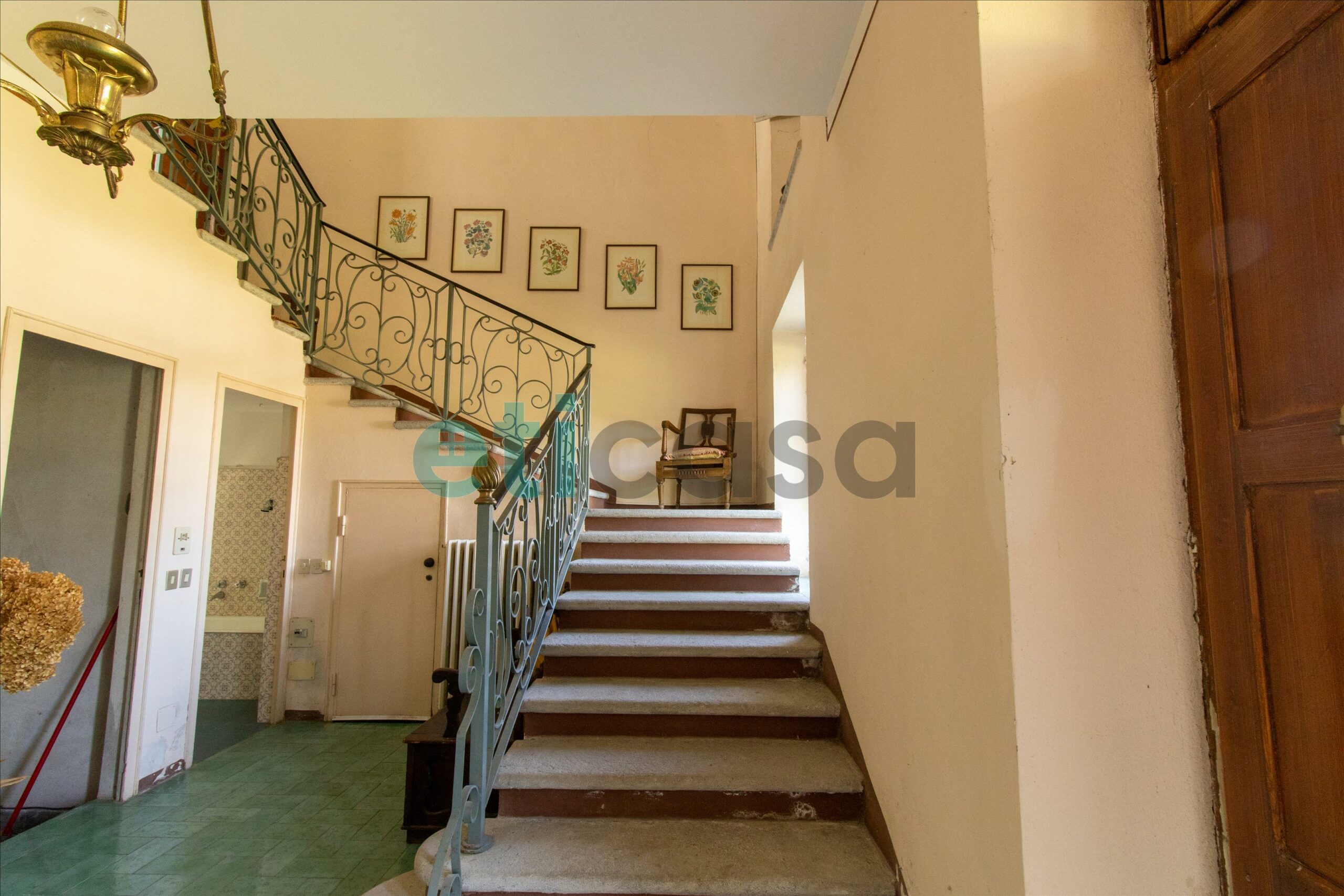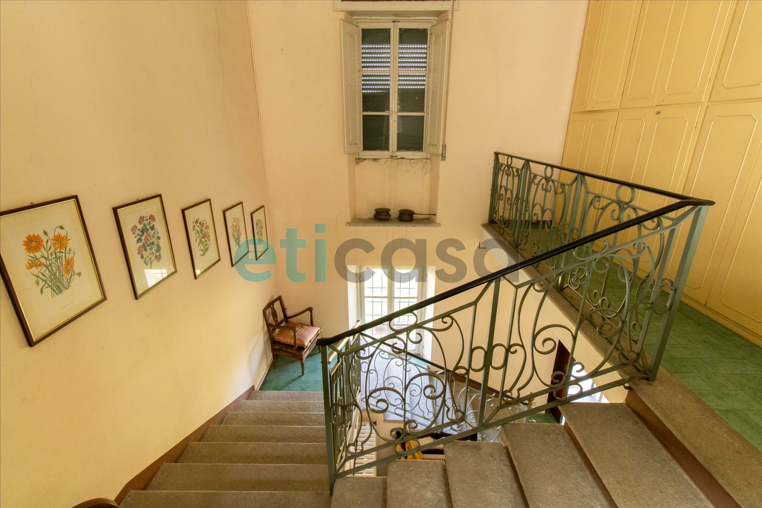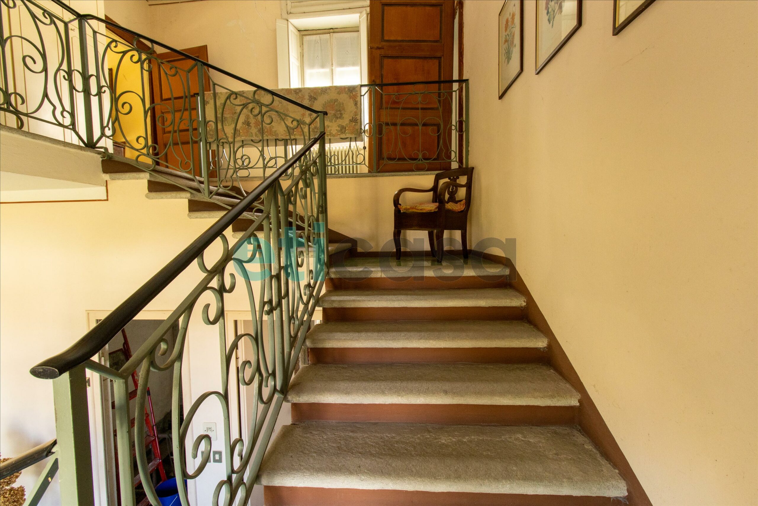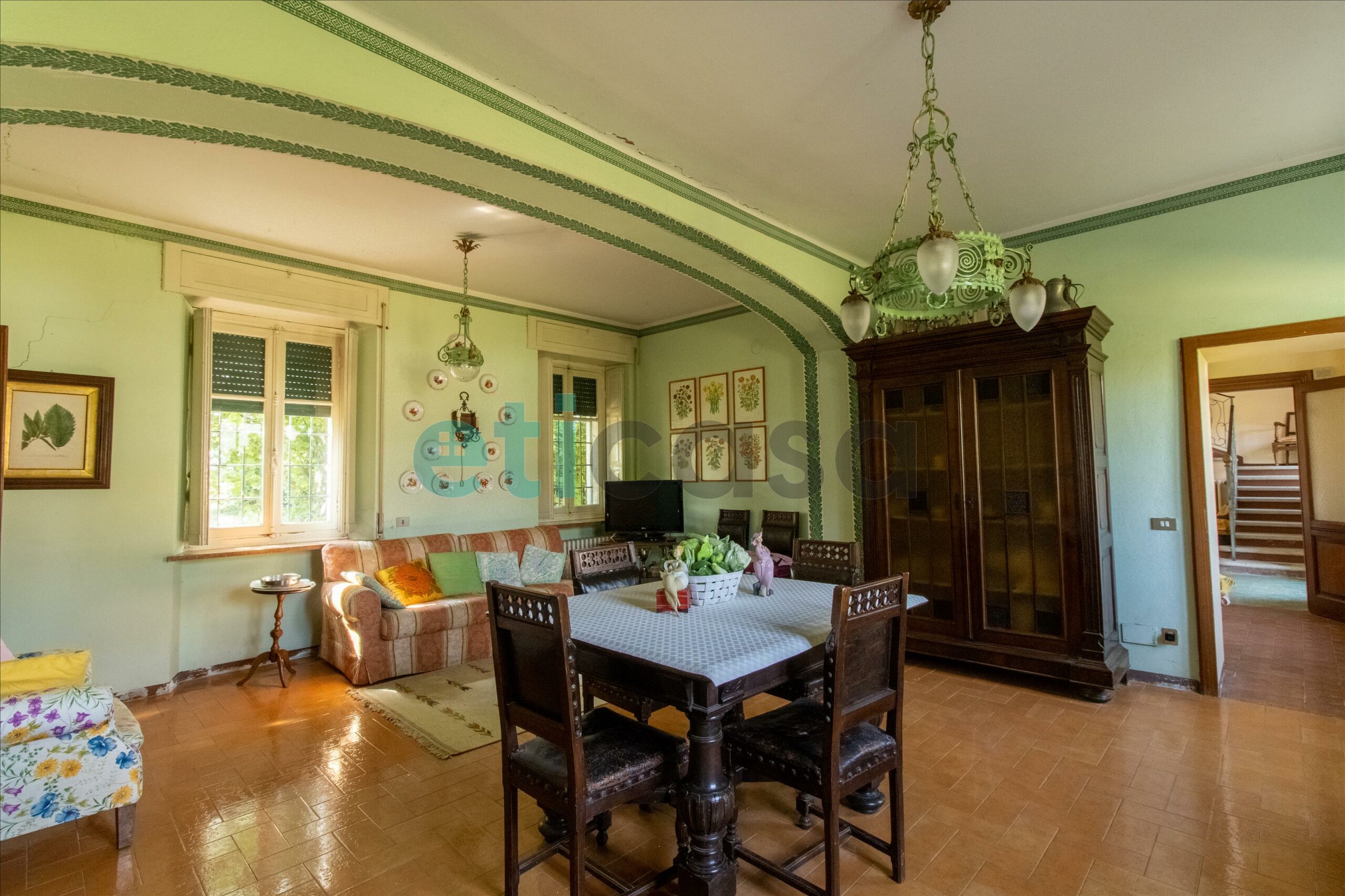 Al piano terra è così composta: ingresso, locale tecnico, bagno, sala da pranzo con camino e cucinotto, secondo bagno e tre saloni, di cui uno con accesso al portico e al giardino.