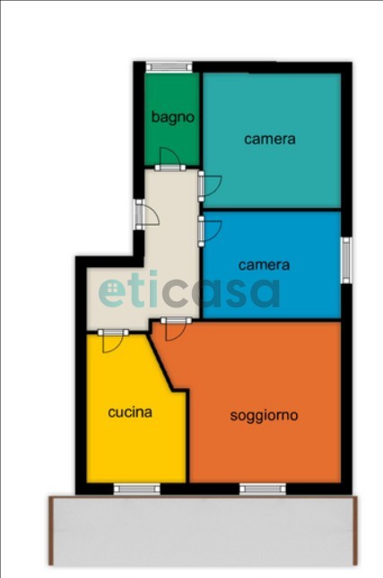 L’immobile, privo di ascensore, si sviluppa su una pianta classica e ben distribuita: ingresso, soggiorno, cucina, due camere da letto e un bagno. Gli ambienti sono luminosi e offrono una buona base su cui lavorare.