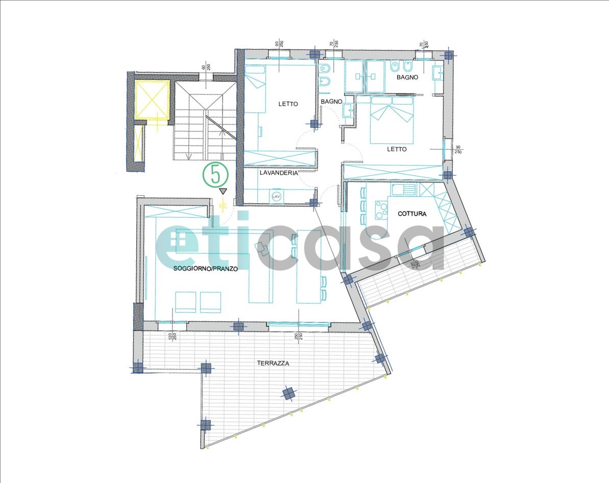 L’abitazione è composta da ampio soggiorno con accesso a una luminosa terrazza, cucina con accesso al balcone, due camere da letto, due bagni finestrati e lavanderia. Possibilità di acquisto di box auto singolo o doppio.